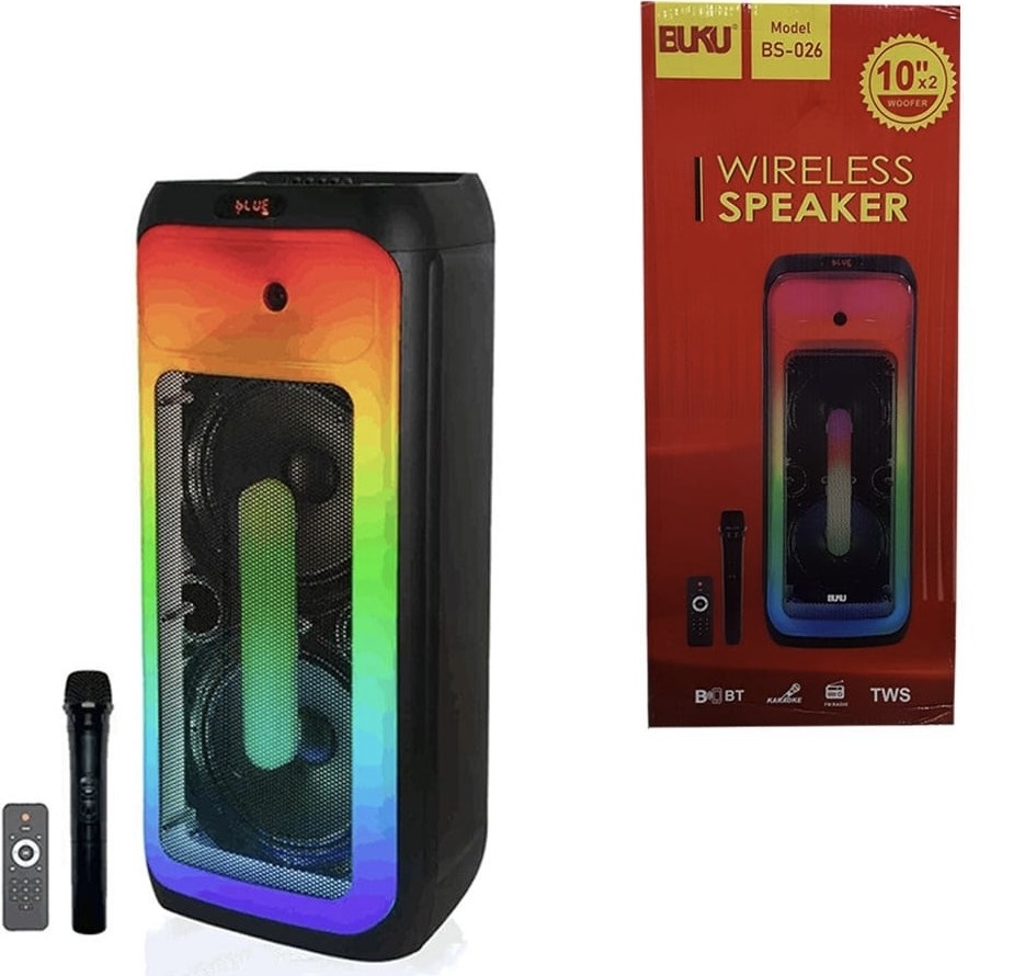 اسپیکر بوکو مدل BS-026 از برند BUKU با ابعاد 33 × 30 × 79 سانتیمتر و وزن 10000 گرم، طراحی شیک و مقاومی دارد. این اسپیکر دارای درگاههای ارتباطی USB، AUX و TF CARD و بلوتوث 5.0 با برد 10 متر است که امکان اتصال بیسیم و با سیم را فراهم میکند. کیفیت صدای این اسپیکر با توان خروجی 60 وات و دو سابووفر بسیار قوی و واضح است. پاسخ فرکانسی آن بین 20 تا 20000 هرتز است و با 5 ولوم تنظیم برای بیس، تریبل و اکو، امکان تنظیم صدا به سلیقه شما را میدهد. باتری این اسپیکر با ظرفیت 11.1V 2400mAh، پس از 4 ساعت شارژ، 2 تا 3 ساعت پخش موسیقی دارد. این اسپیکر دارای نشانگر LED و رقص نور RGB، قابلیت اتصال به دو دستگاه همزمان، پشتیبانی از کارت حافظه، رادیو و تکنولوژی TWS است. اقلام همراه شامل میکروفن بیسیم، ریموت کنترل، دفترچه راهنما و کابل شارژ